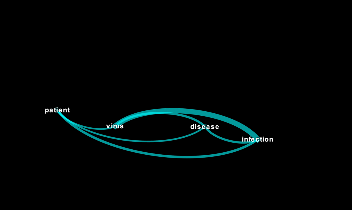 Now let’s look into this graph step-by-step based on the rendering completeness of graph representation. In general, graph rendering with lower completeness highlights a fundamental structure of the graph. Increasing rendering completeness extends the network complexity by including more nuanced nodes and edges. The weight of an edge, visualized as the width, indicates the prevalence of co-occurrence between any two terms. A graph with 20% completeness reveals core connections (or research interests) focusing on infection and patient, as well as some clinical and epidemiological research compared to “SARS” and “Influenza.” Multiple urban-related terms are included here, such as “poverty”, “job”, “mobility”, and “policy”. Some terms such as design and response, may carry different urban or clinical meanings depending on specific context.